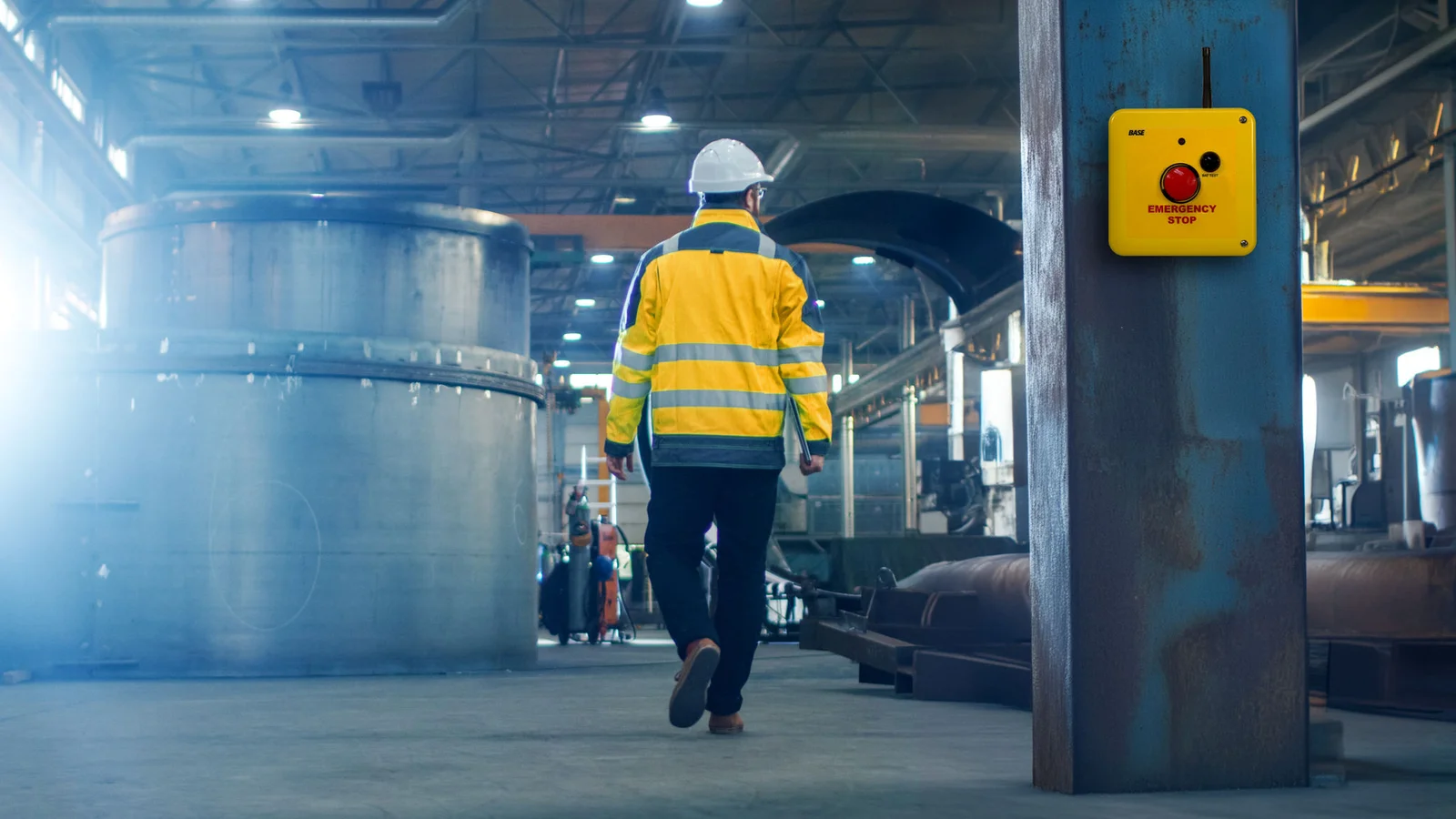 Pressing the Emergency Stop button causes the receiver/controller unit to trigger a shut down. The system cannot be rebooted until the E-Stop button is pulled out and a manual receiver/controller reset is performed. E-Stop buttons are dual contact - dual-channel, and comply with global E-Stop switch requirements. Systems will fail safe, triggering an automatic E-Stop with any loss of main line electrical power supply to the receiver/controller unit.